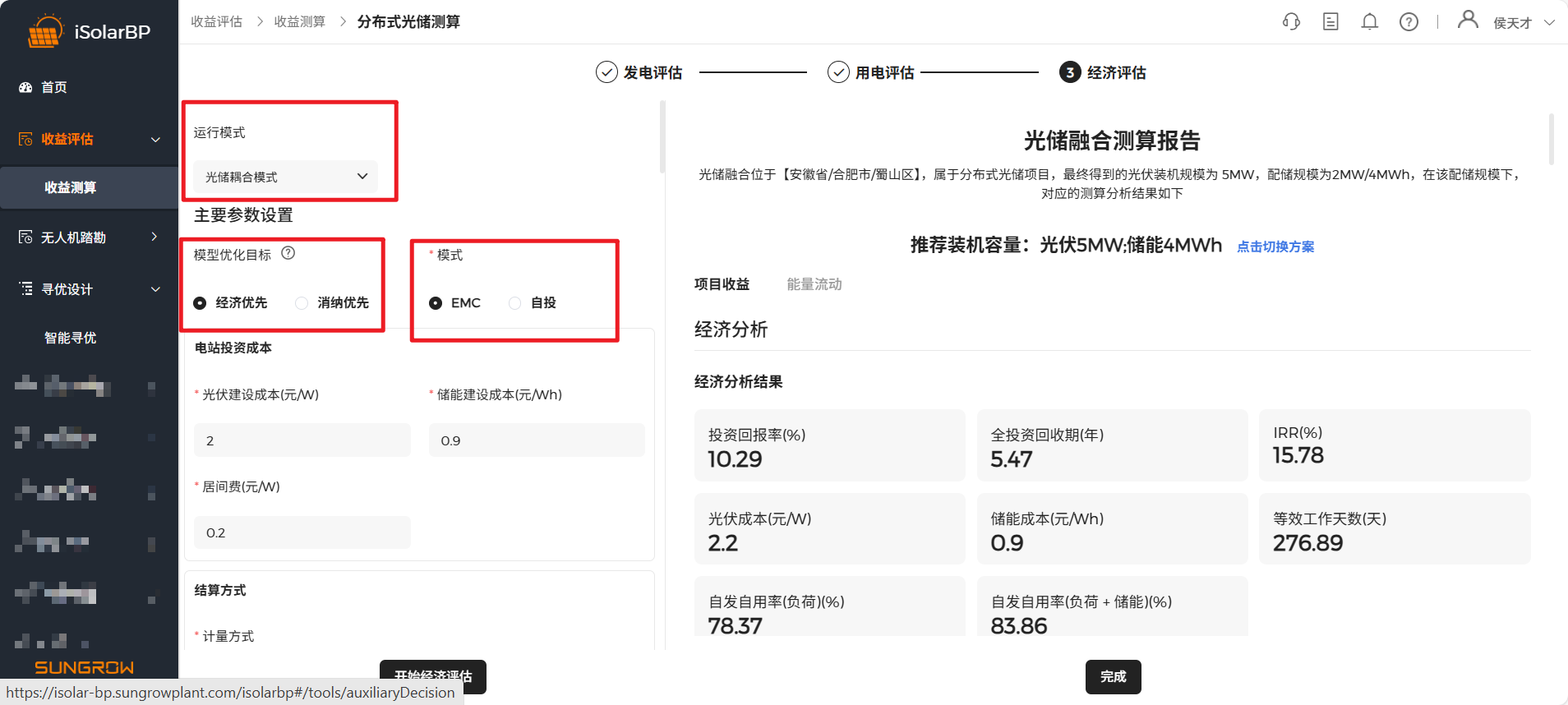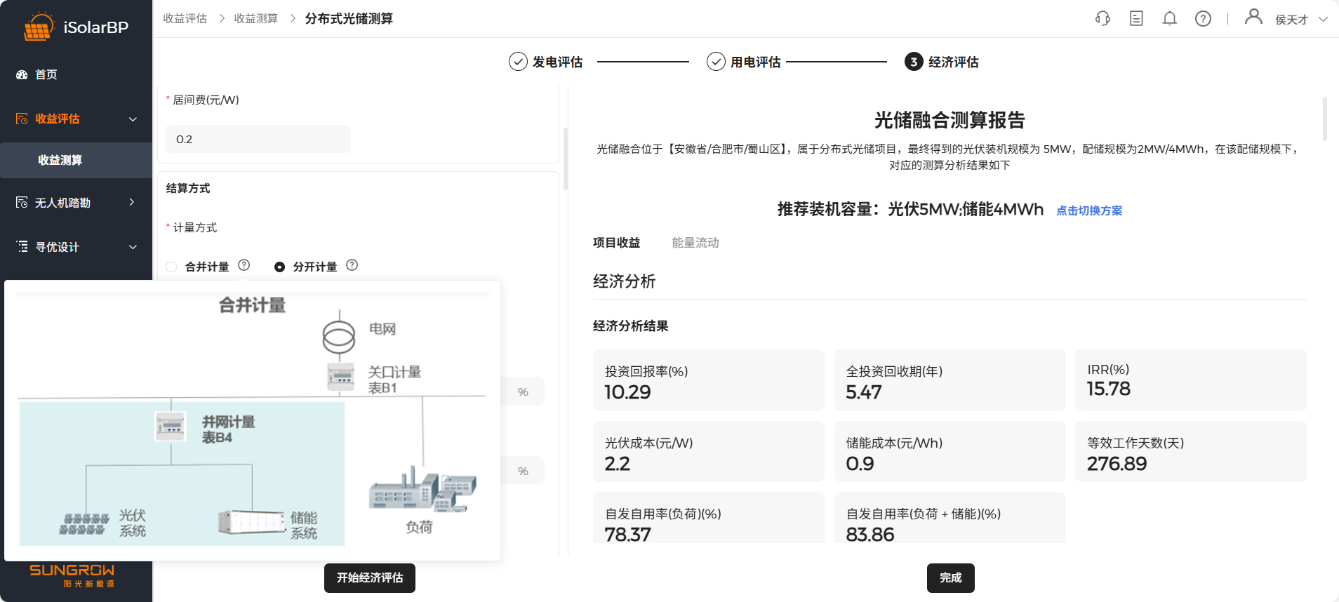 点击 “开始经济评估” 按钮开始测算,测算完成后进行测算结果查看,左侧记录历史测算结果,点击切换方案可查看不同配储方案测算结果,软件根据配储起始值会推荐10套配储方案。